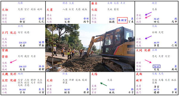 Pada Chart ini, terdapat 天機太陰 + 地劫, diman 天機 adalah excavator, 太陰 adalah air, yang terjadi adalah pemerintah kota memperbaiki saluran jalan depan rumahnya secara besar-besaran, alat berat dan tumpukan tanah di mana-mana, sehingga ia tidak bisa membuka toko dirukonya selama tiga bulanan.