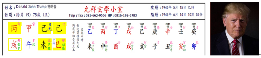 Setiap kali huruf Xin muncul ia selalu sial, kecuali tahun Monyet api (丙申) 2016, ketika ia terpilih sebagai presiden Amerika, Logam muncul bersamaan dengan Api besar Bing (丙), periode Chou (丑) telah membuka gudang Wei (未), karena itu malah bagus dan mengantarkannya ke kursi kepresidengan, mencapai puncak tertinggi dalam hidupnya.