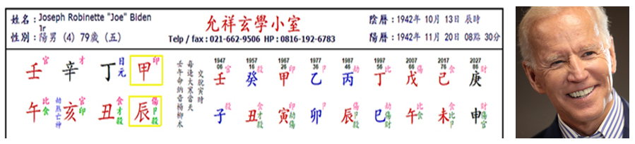 Pada periode hidup Wuwu (戊午) di tahun Kerbau tanah (己丑) 2009, Biden berhasil menjabat sebagai wakil presiden dan terpilih kembali pada tahun Kuda kayu (甲午) 2014.