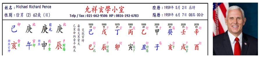Saat ini ia berada pada periode hidup Babi air Guihai (癸亥), karena air masuk gudangnya Chen (辰), membuat kerja awal berupa Anhe (暗合) antara Wu (午) dan Hai (亥) terganggu, itu berarti kekuatan bosnya telah melemah, karena itu diperkirakan sulit memasuki istana gedung putih untuk kembali menabat wakil presiden.