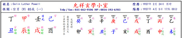 Dekade hidup Ayam api (丁酉) merupakan masa puncak dalam kehidupannya, dimana pada tahun Ular logam 2001 (辛巳) hingga Ayam kayu 2005 (乙酉) berhasil mendapat masa puncak karir dan mencatatkan sejarah baru bagi AS sebagai Sekretaris Negara Amerika Serikat ke 65.