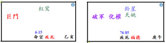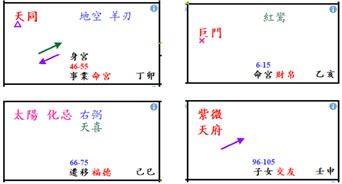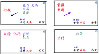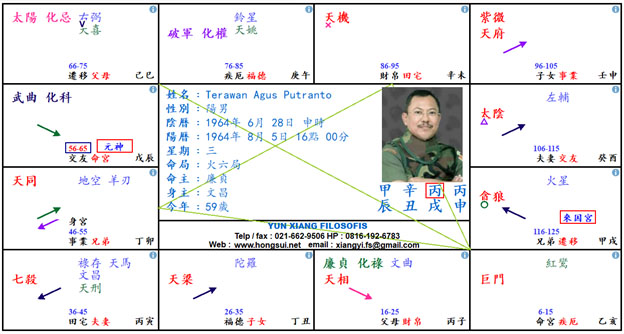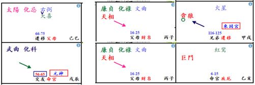 Periode hidup Naga tanah (56-65), terbentuk kombinasi bintang Z4-µ3 + F3-µ1↙ (武曲化科 + 貪狼祿入), suatu keadaan sangat bagus dalam hidupnya ketika terpenuhi Z3-µ4 (太陽化忌) yang datang dari istana ortu (父母宮).