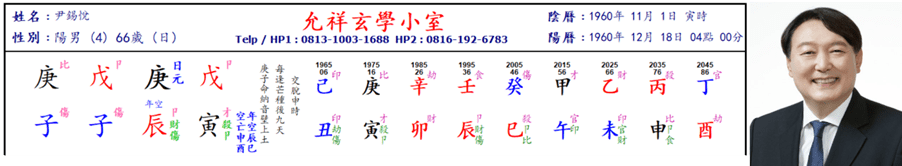 Sayang sekali, periode hidup berikutnya adalah Yiwei (乙未, 2025-2034), merupakan periode hidup sangat buruk, karena Wei (未) langsung menggudangkan huruf kuncinya Yin (寅), membuat dirinya jatuh langsung dari langit ke sembilan di dalam neraka. Sebelumnya pada tahun Jiachen (甲辰) 2024, ia melakukan sebuah kesalahan sangat besar, karena masih berada dalam periode dan tahun yang baik, ia masih bisa bertahan sebagai pimpinan Korsel, sekalipun wewenangnya telah dibatasi.