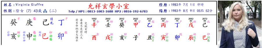 Shen (申) dan Hai (亥) berhubungan dalam bentuk Chuan (穿), memberi informasi bahwa dirinya (Virginia Guiffre) lahir dalam keluarga bermasalah. Ia mengalami masa kecil yang buruk, penuh dengan trauma fisik dan mental yang berat.