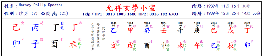 我們來研究一下他的八字。1939年12月26日出生於美國紐約市、布朗克斯區。八字排出來如下 :