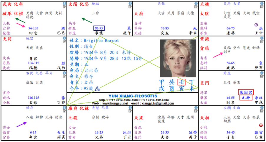 Bagan astrologinya memunculkan bintang perubahan Hualu (化祿) dan Huake (化科) sektor Shen (申) dan bintang perubahan Huaquan (化權) di sektor Chen (辰). Tahun 1956 adalah tahun yang tepat jatuh di Shen, Bardot membintangi ‘And God Created Woman’ yang dirilis tahun berikutnya. Film tersebut menampilkan dirinya tanpa alas kaki, rambut pirang acak-acakan, tubuhnya terbentang dalam pose menantang di bawah sinar matahari. Ini langsung mengubahnya menjadi ‘ikon era itu’. Dia adalah proyeksi keinginan kolektif di Prancis pasca-perang, simbol pembebasan, dan “bom seks” yang dikemas secara komersial. Tetapi beban citra ini hampir segera menghancurkan kenyataan hidup wanita yang memerankannya.